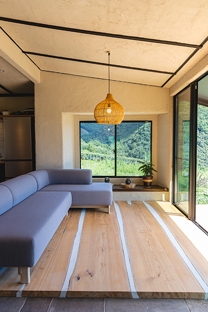 玄関からつながる広めのテラスの先には山々の稜線と富士山、眼下には盆地ならではの里山の風景を眺めることができ、上質なルームシューズに履き替えくつろぎの時間をお過ごしください。